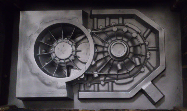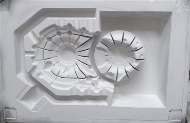 Positivmodell wird in Polystyrolschaum CNC gefräßt mit einer Schlichte versehen und in losen Quarzsand eingerüttelt